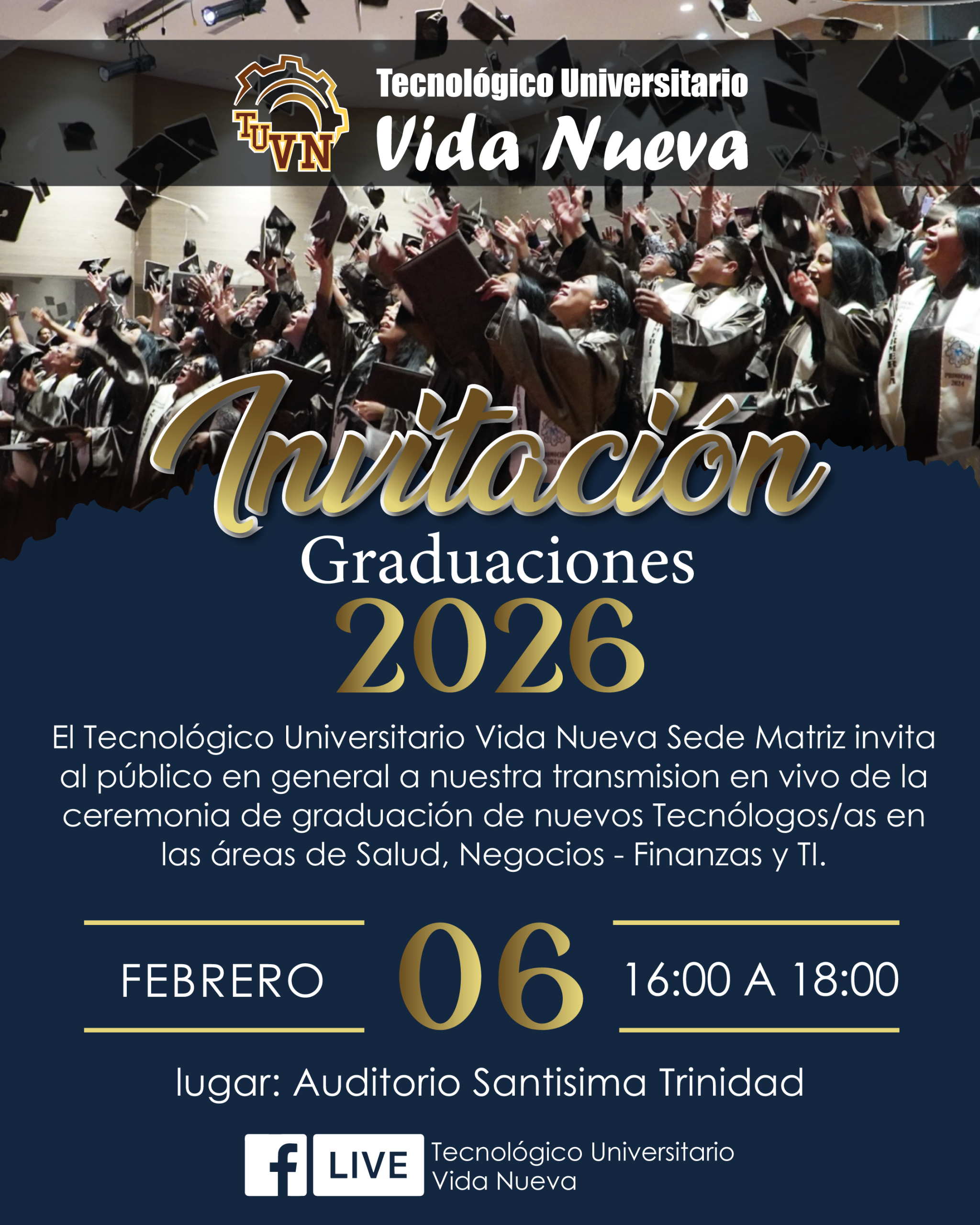 El Tecnológico Universitario Vida Nueva (TUVN) es una institución de educación superior legalmente constituida, se crea el 14 de abril de 1998, y la Ley Orgánica de Educación Superior (LOES) le incorpora el 13 de abril de 2000 al Sistema Nacional de Educación Superior y, el Consejo Nacional de Educación Superior (CONESUP), con registro Nº 17063, le reconoce como tal.
